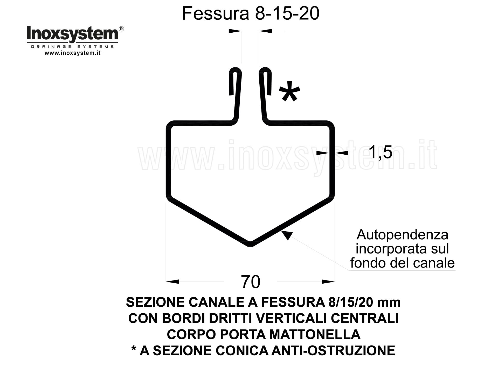 Stainless steel channel with central slot, vertical edges and flat top surface for floor tile installationNew: slot channel with epoxy filled frame edge is LOAD CLASS D400 CERTIFIED+CENTRAL SLOT VERTICAL EDGES FOR FLOOR TILE WITH ODOR TRAPStainless steel channel with 8/15/20 mm central slot, vertical edges and flat top surface for floor tile installation, 150x150 mm floor drain with odor trap and removable filter LINE 1550Stainless steel channel with 8/15/20 mm central slot, vertical edges and flat top surface for floor tile installation, 150x150 mm floor drain with tileable cover, odor trap and removable filter LINE 1560CENTRAL SLOT VERTICAL EDGES FOR FLOOR TILE WITHOUT ODOR TRAPStainless steel channel with 8/15/20 mm central slot, vertical edges and flat top surface for floor tile installation, 80x80 mm inspection unit with satin finished top cover and direct outlet LINE 1570Stainless steel channel with 8/15/20 mm central slot, vertical edges and flat top surface for floor tile installation, 80x80 mm inspection unit with tileable top cover and direct outlet LINE 1580Stainless steel channel with 8/15/20 mm central slot, vertical edges and flat top surface for floor tile installation, direct outlet with no inspection unit LINE 1590SEE ALSOStainless steel Slot channels with visible satin finished edgesStainless steel Slot channels with central slot and vertical edgesStainless steel Slot channels with lateral slot and vertical edgesStainless steel Slot channels with horizontal edgesStainless steel channel with central slot, vertical edges and flat top surface for floor tile installationStainless steed drainage channel with offset slot, vertical edges and flat top surface for floor tile installationStainless steel channel with central slot, vertical edges and flat top surface for floor tile installation Facebook Twitter