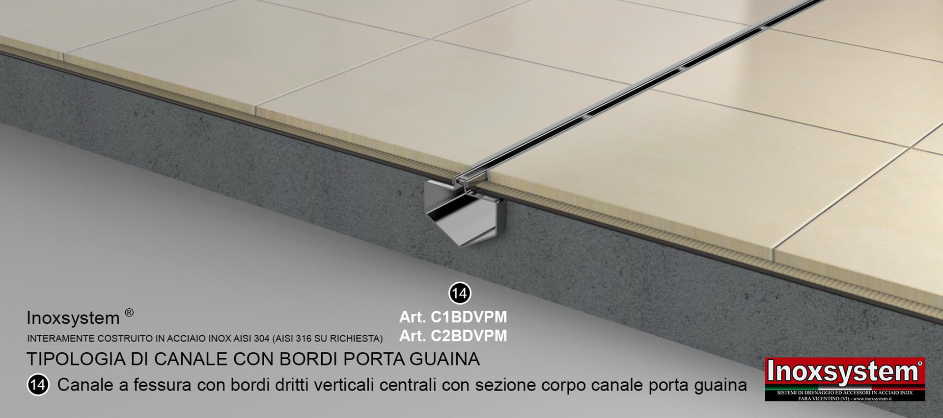 A discreet drainage solution available with a 20 mm slot (standard - Inoxsystem® article C2BDV), a 15 mm slot (medium - Inoxsystem® article C15BDV), or an 8 mm slot (heelsafe - Inoxsystem® article C2BDV) tapered to prevent blockage.